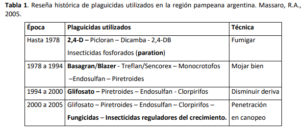En otros casos, los productos utilizados no permiten visualizar fácilmente su efecto (insecticidas, fungicidas), por lo cual la misma puede pasar desapercibida (Costanzo y otros, 2019). Revisando la historia vivida en el uso de plaguicidas en Argentina, se puede afirmar que el “descubrimiento” de la deriva con equipos pulverizadores terrestres se produjo con la aplicación del herbicida glifosato a partir de los años 1994/95 (Tabla 1). El empleo de este producto para realizar barbechos químicos después de los cultivos de verano coincidía, en muchos casos, con cultivos de trigo o de alfalfa, vecinos a esos lotes.