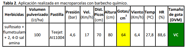 En la EEA INTA Oliveros se conduce, desde el año 2006, un ensayo de larga duración (ELD) con diferentes secuencias de cultivos extensivos (trigo, maíz, soja de primera y segunda ocupación), en macroparcelas (13 m de ancho por 200 m de largo). Las labores para cada cultivo se realizan con maquinaria habitual en los campos de producción agrícola de cualquier empresa de producción. En una oportunidad en un tratamiento en poscosecha de soja de primera, se realizó un control de malezas en barbecho químico retrasado, a principios del mes de octubre, con presencia de “rama negra” todavía en rosetas, rastrera. Las macroparcelas para barbecho químico estaban contiguas con otras ocupadas por cultivo de trigo en hoja bandera (Figura 1). Por ello, era imprescindible realizar la pulverización SIN DERIVA para no afectar los cultivos de trigo linderos. En la Tabla 2 se describe la aplicación realizada.