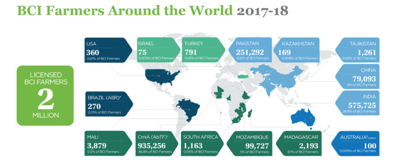 En la campaña 2017-18, los productores certificados BCI produjeron más de 5 millones de toneladas de algodón «Better Cotton» en 5,3 millones de hectáreas, suficiente cantidad para hacer más de 2.5 billones de pares de jeans.