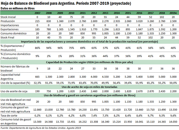 Gracias a la abundante oferta de materia prima, la ley de mezcla en gasoil B10 y la exitosa proyección exportadora, Argentina continúa siendo uno de los productores líderes de biodiesel a nivel mundial, aun cuando su industria opera al 50% de su capacidad instalada. Para 2019 el USDA estima una producción anual de biodiesel de 2.500 millones de litros, un 9,4% menos que en 2018, y muy por debajo del producto récord alcanzado en 2017 de 3.260 M lts.