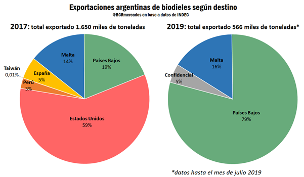 En febrero de 2019, la Comisión Europea y Argentina acordaron una cuota anual libre de impuestos de 1.360 millones de litros de biodiesel por año, a un precio mínimo fijado a partir del valor oficial FOB del aceite de soja argentino más costos de producción y flete. En el mes de marzo, entonces, se registraron los primeros despachos a la Unión Europea de 2019. En los meses subsiguientes, los Países Bajos se consolidaron como el principal destino de exportación europeo para el biodiesel argentino, con despachos por 450.000 toneladas en lo que va del año, un 79% de los embarques totales registrados entre enero y julio. Con esto, la participación del mercado neerlandés en el total se dispara creciendo en 60 puntos porcentuales. El crecimiento en su participación no responde únicamente al aumento del volumen de biodiesel importado, sino a la menor cantidad total exportada y a la ausencia, en 2019, de un gran mercado importador de biodiesel: Estados Unidos. El país de américa de norte, principal destino del biodiesel argentino hasta 2017, pasó de representar el 59% del mercado en 2017 a no importar más biodiesel tras el cierre de su mercado a las exportaciones del biocombustible argentino.