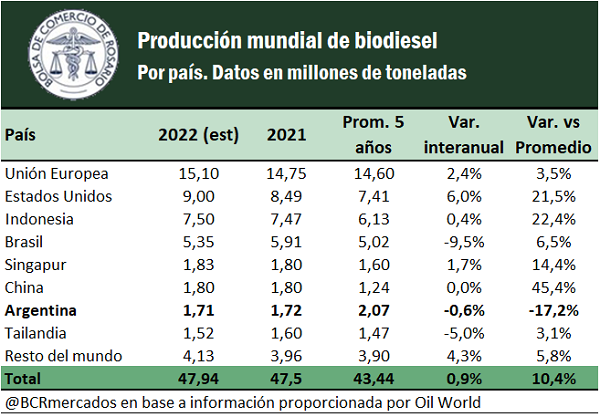 Estos factores han llevado a la producción de biodiesel a romper récords productivos año tras año a nivel mundial y en los principales participantes del mercado. Con este contexto, nuestro país será el único de los grandes productores de biodiesel con una fuerte baja en su producción para los últimos cinco años, de acuerdo con el último balance mundial de biodiesel de Oil World. La producción de biodiesel estimada para 2022 se encuentra más de un 17% por debajo del promedio del lustro 2017-2021.