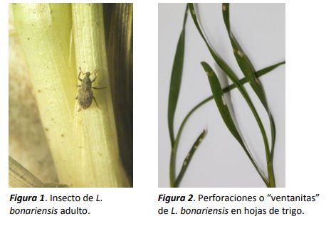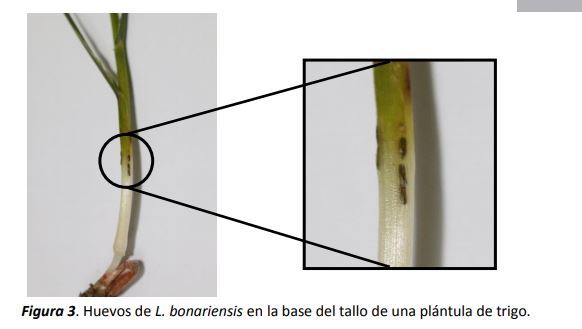 Los adultos de L. bonariensis (Figura 1) son de tamaño pequeño (3 mm de largo), cuerpo grisáceo y están cubiertos de escamas cerosas a las que se adhieren partículas de suelo que favorecen su mimetismo. Estas características, sumadas a la inmovilidad que adopta al ser perturbado y a sus hábitos crepusculares, dificultan su observación y registro. Se alimentan de las hojas, a las que realizan pequeñas perforaciones o “ventanitas” sin ocasionar daños graves (Figura 2). Estos orificios en el tejido vegetal, constituyen indicadores de su presencia y determinan el inicio de la oviposición. La presencia de esta plaga se infiere a través de la observación de sus huevos (Figura 3), que suelen estar colocados en la parte interior de las vainas, hojas y tallos próximos a la superficie del suelo. Los huevos tienen forma alargada con los extremos redondeados; miden aproximadamente 1 mm de longitud, inicialmente su color es verde amarillento y se tornan marrón oscuro casi negros cuando están próximos a eclosionar. Generalmente las posturas se disponen encastradas en hileras de 1 a 5 huevos. L. bonariensis comienza a oviponer a principios de invierno, en etapas iniciales del desarrollo del cultivo de trigo hasta macollaje y principios de encañazón (Gallez et al., 1996; Gamundi y Molinari, 1996).