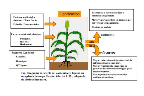 El menor o mayor contenido de lignina en la planta afecta/interactúa con el ambiente favoreciendo al cultivo según su utilización, pero a su vez lo hace más vulnerable a factores bióticos y abióticos.Fig.2