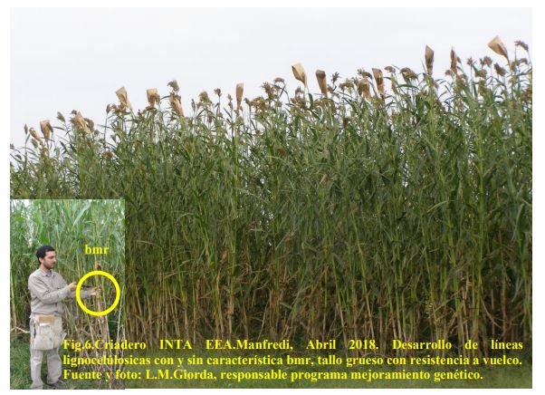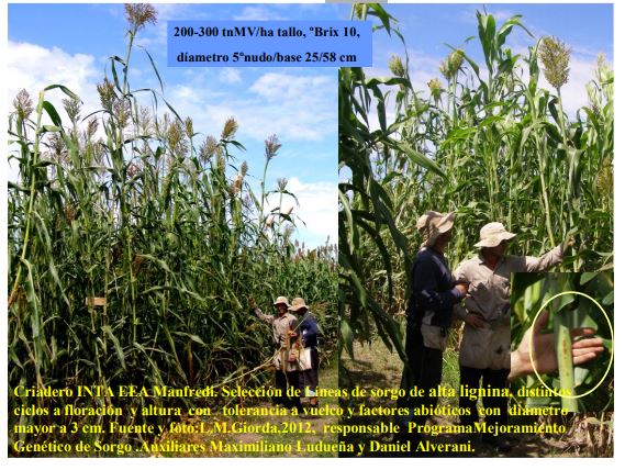 Con este criterio INTA continuó en la cartera de proyectos 2013 con estos desarrollos, y los materiales selectos en el Criadero de Sorgo de la EEA Manfredi-INTA son probados y seleccionados en diferentes ambientes para distintos propósitos de utilización. (Fig.5, 6 y 7). Se busca obtener materiales con alto contenido de lignina, lo suficiente para sostener plantas de gran porte sin que vuelquen, de alta productividad de biomasa y de rápido secado (para procesos termoquímicos) y con las características agroindustriales requeridas; a su vez se están desarrollando genotipos similares pero con la característica bmr, en un porcentaje de disminución de la lignina o con un estructura que facilite o eficientice la hidrólisis enzimática y el proceso de conversión del bagazo, pero que no afecte su resistencia al vuelco de la planta.