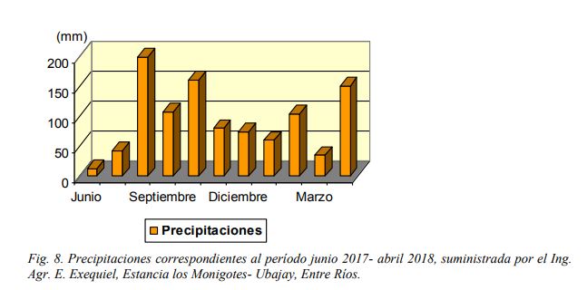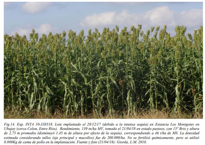 Se sembraron tres variedades (un híbrido comercial de INTA y dos experimentales). La semilla de mayor disponibilidad, permitió sembrar 2,5 has del Exp INTA 10-338518. La siembra se realizó a 35 cm entre surcos, el 27/12 /17 debido a una intensa sequía, haciéndolo después de una lluvia de 35 mm del día 23/12. El acumulado de diciembre fue 74 mm (Fig. 8). Se utilizó cama de pollo en lugar de fertilizante químico, aplicándolo en octubre al voleo sin incorporar en una dosis de 8.000 Kg/ha. El lote había tenido una aplicación similar en 2016 de también unos 8.000 Kg/ha y posterior siembra de soja (Com. Personal Ing. Agr. E. ExequielEstancia Los Monigotes). La sequía de enero (acumulado 60 mm) y deficiencias hídricas de Febrero (104 mm distribuidos el día 11 que llovió 30 mm y el 27 con 74 mm) demoró el desarrollo del cultivo, no obstante, lo cual, se fue recuperando mostrando buen vigor a fines de Febrero y Marzo (Fig. 7, 8 y 9). Asimismo, además del déficit hídrico, las altas temperaturas del verano y la evapotranspiración (alta demanda atmosférica), afectó la tasa de crecimiento del cultivo sin mostrar síntomas por efecto sequía, dado por sus características de tolerancia bajo esas condiciones. Esta situación edafoclimática, coincidente con el período de demanda hídrica del mismo, resultó en una disminución en aproximadamente 1.50 en la altura del cultivo.