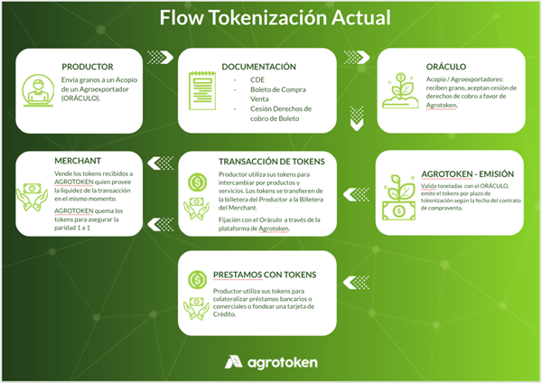 Para poder validar la disponibilidad de los granos depositados en el acopiador o exportador, el productor debe tener un certificado de depósito electrónico (CDE) el cuál debe ser ingresado al sistema. 24 horas después se debe cargar el boleto de compraventa de granos. Cuando se verifica este contrato de compraventa, para completar el proceso de tokenización, se ceden los derechos de cobro del contrato de compraventa a favor de agrotoken. Para esto se realiza una carta de oferta por un plazo determinado. Finalizado este procedimiento, se emiten tokens equivalentes a los granos depositados los cuales pueden ser utilizados por el productor en compraventa de semillas, vehículos, maquinaria, combustible, servicios o también utilizarlos como garantías en préstamos.