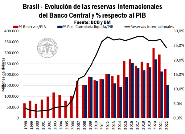 En 2022 Brasil terminó el año con reservas internacionales por US $324.703 millones, siendo un mínimo desde el año 2010 pero un guarismo más que aceptable. El gran crecimiento de las reservas internacionales fue entre 2005 y 2012 que se multiplicaron por siete, pasando de US $53.799 millones hasta US $373.147 millones. En estos años la economía creció a una tasa anual real promedio del 4% y la proporción de reservas respecto al PIB (a valores corrientes) pasó de 6,0% a 15,1%. Es decir, hubo crecimiento sostenido con incremento de reservas internacionales, lo cual rompe la tesis de que las economías en desarrollo están sujetas a crisis seculares de balanza de pagos que imposibilitan la estabilidad económica a lo largo del tiempo.