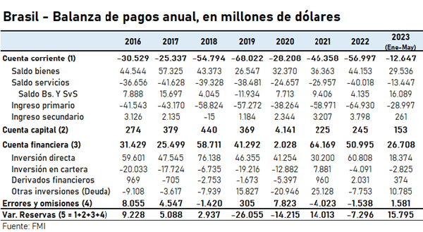 Si observamos la cuenta financiera de la balanza de pagos, vemos que el principal componente de financiación es la inversión extranjera directa (IED). De hecho, de acuerdo a la Comisión Económica para América Latina y el Caribe (CEPAL), Brasil fue el principal país receptor de IED en la región en 2022, y el quinto país receptor del mundo, por detrás de Estados Unidos, China, Singapur y Hong Kong.