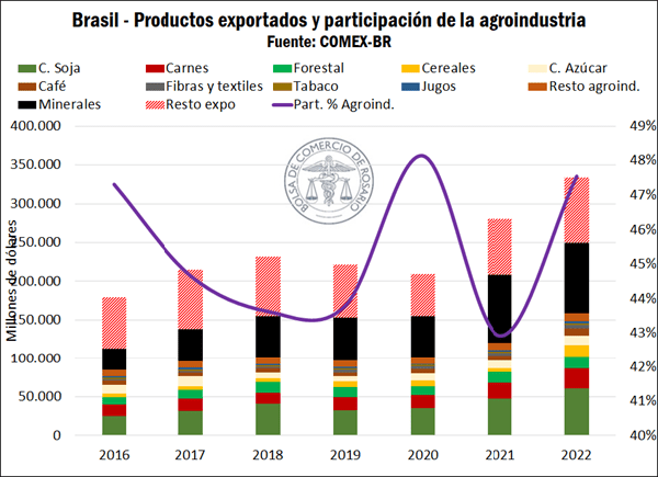 Si examinamos en detalle los bienes exportados por Brasil, se observa que la agroindustria tiene una participación crucial dentro los mismos, y contribuye de manera fundamental con el saldo positivo de la cuenta comercial. Los productos agroindustriales, entre ellos el complejo soja, carnes, productos forestales, cereales y caña de azúcar, han tenido una participación de entre el 43% y 48% durante los últimos años. Específicamente, el complejo soja es el de mayor participación dentro de las exportaciones, llegando a un saldo exportable de US $60.820 millones en 2022. De hecho, Brasil se consolida como el mayor exportador de soja a nivel mundial, alcanzando el 55,6% de las exportaciones mundiales en 2022. Por su parte, se observa también una gran participación de los minerales dentro de los productos exportados, representando en 2022 un 27% del total de las exportaciones del país.