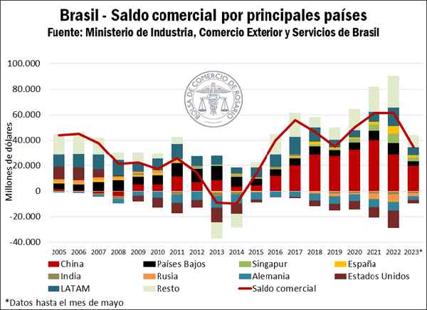 En cuanto al destino de las exportaciones, el gráfico a continuación muestra los principales países que mantienen una relación comercial con Brasil, así como también sus respectivos saldos comerciales. Se destaca China como principal socio comercial, país con el cual Brasil ha mantenido un saldo comercial positivo desde 2009. La relación comercial con China se sustenta principalmente en la venta de soja. En 2022, el 68,3% de la cantidad de soja exportada de Brasil tenía a China como país receptor. Se destacan también como principales socios comerciales Países Bajos y Singapur.