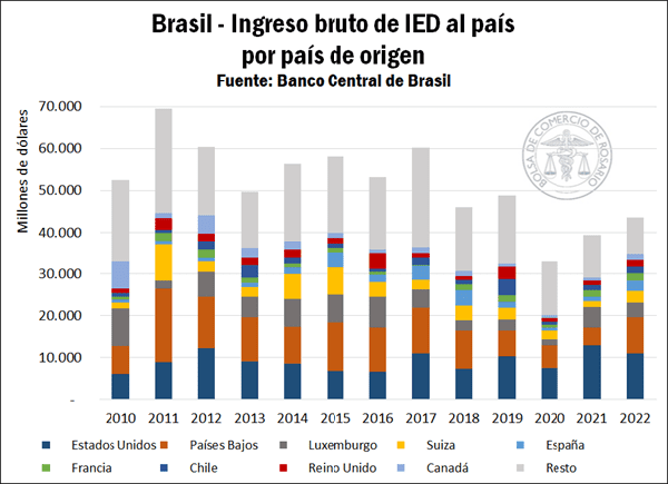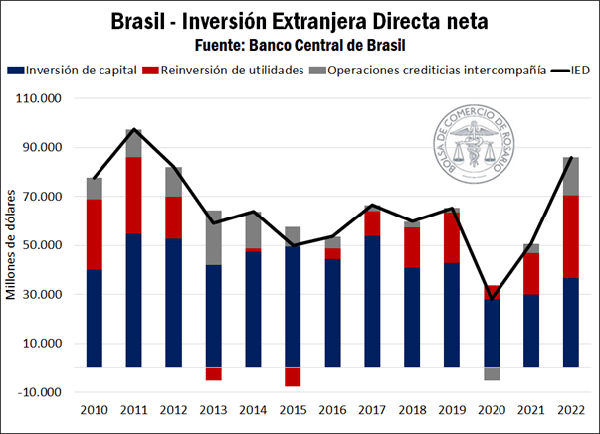 El siguiente gráfico muestra la composición de la IED neta en Brasil desde 2010 en adelante. La misma se compone, de acuerdo al Banco Central de Brasil, de entradas netas en acciones (inversión de capital), utilidades reinvertidas y operaciones crediticias intercompañía. Estas últimas comprenden los créditos otorgados y las amortizaciones pagadas entre empresas del mismo grupo económico residentes en diferentes países, excepto las sociedades financieras. Se destaca una gran participación de la inversión en capital.