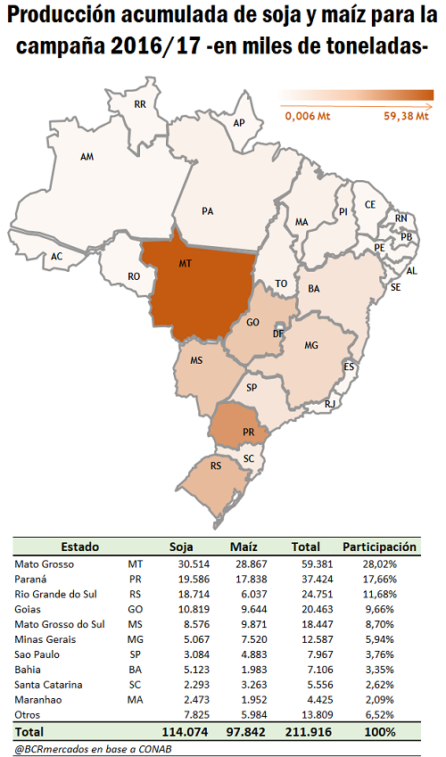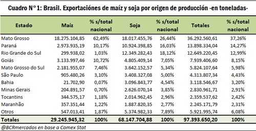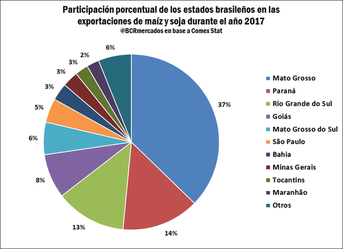 A partir de un análisis propio y tomando como referencia datos oficiales del portal Comex Stat para el año 2017, en el cuadro N°1 puede verse que el principal exportador de estos granos en Brasil es Mato Grosso, con poco más de 36 millones de toneladas (Mt), o el 37 % de las exportaciones brasileñas (soja más maíz), seguido por Paraná, que exportó cerca de 14 Mt, y Rio Grande do Sul, que superó las 12,5 Mt. Otros estados que se destacan son Goiás y Mato Grosso do Sul, con cerca de 8 y 6 millones de toneladas respectivamente. Más atrás aparecen São Paulo, con cerca de 4,5 millones de toneladas, y Bahía, con algo más de 3 millones de toneladas de soja y maíz exportadas.