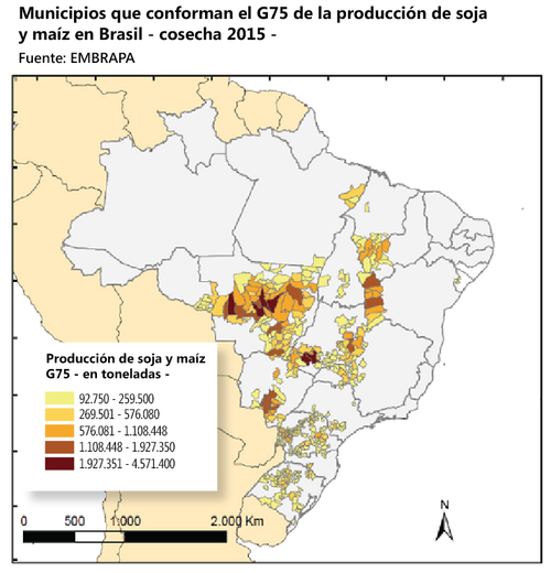 En el mapa adjunto se indican los municipios que en conjunto representan el 75 % de la producción de soja y maíz de Brasil, denominados Grupo 75 (G75). Estos municipios se destacan como estratégicos para la región por su representatividad en la cantidad producida, siendo estratégica su inserción logística con vistas a la exportación. Estos municipios producen soja y maíz entre 92.700 tn y 4,5 millones de toneladas, en forma individual. En el mapa puede verse su localización y rango productivo.
