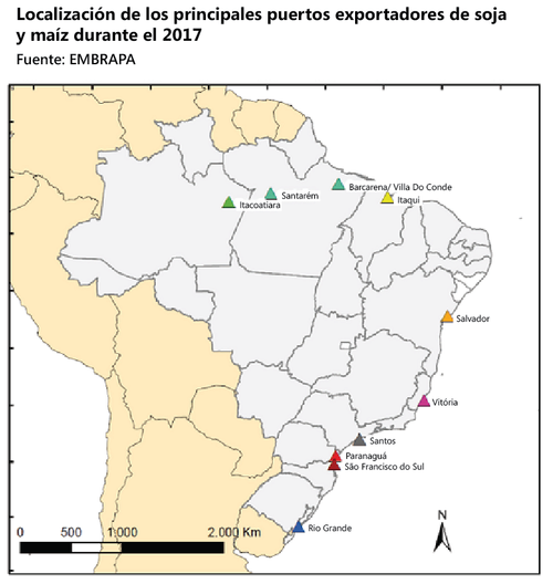 En la siguiente imagen se identifica la ubicación de los principales puertos utilizados por Brasil para la exportación de la producción de soja y maíz. Fueron incluidos los diez principales puertos que en conjunto representaron más del 94 % de los embarques de estos productos en 2017, según datos de la ANTAQ (Agencia Nacional de Transportes Acuáticos).