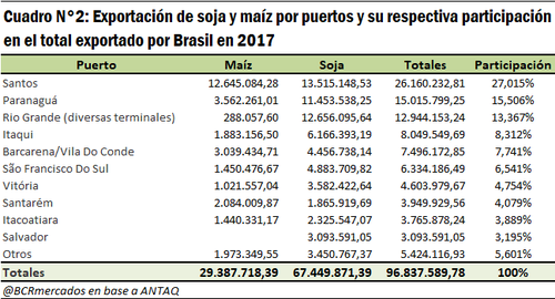 En este análisis, basado en datos de la ANTAQ, se verificó que en 2017 Brasil embarcó 96,8 millones de toneladas de maíz y soja por medio de los siguientes puertos: Santos (27,02 %), Paranaguá (15,5 %), Rio Grande –considerando las terminales públicas y privadas ubicadas en el sector portuario del municipio- (13,37 %), Itaqui (8,13 %), Barcarena/ Villa Do Conde (7,74 %), São Francisco do Sul (6,54 %), Vitória (4,75 %), Santarém (4,08 %), Itacoatiara (3,89 %), Salvador (3,2 %) y otros (5,6 %). Estos datos constan en el cuadro N°2.