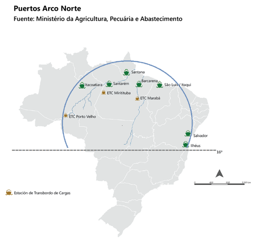 Para el 2017, los puertos de la región sudeste y sur de Brasil redujeron su participación a un 62,5 %, mientras que a su vez, se incrementó el peso en las exportaciones de los puertos de la región septentrional brasileño o del llamado Arco Norte. Estas terminales de despacho de granos pasaron de acaparar el 21,8 % de las exportaciones en 2015, a ser responsables del 27,2 % de los envíos realizados en 2017.