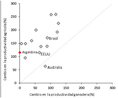 Para interpretar los cambios en las producciones entre países, se analizaron las variables que explican la producción. Argentina, y también Brasil, lidera el aumento de la superficie destinada a los cultivos (263,1%), pero pertenece al grupo de países que menos ha variado en existencias bovinas (19,6%, Figura 2). El cambio en la magnitud de la actividad agrícola (hectáreas) aumentó proporcionalmente más con respecto a la ganadería (existencias). Cuando se analiza la productividad, se observa también un aumento más que proporcional en la productividad agrícola con respecto a la productividad ganadera (115,5 vs 0,4%, respectivamente, Figura 3). Solo cuatro países muestran un incremento en PP (Brasil con 52%, Turquía con 30%, Colombia con 10,3% y México con 4,5 %). Argentina, junto a Estados Unidos y Sudáfrica, son los países con menor reducción de PP: -5,1%, 3,8% y 3,2%, respectivamente (Tabla 1).