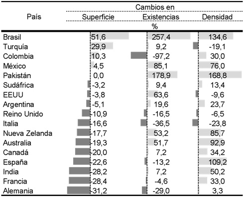 Tabla 1. Porcentaje de cambio en la superficie destinada a pastizales y praderas, existencias y densidad bovina para los principales países productores de carne vacuna. (Años 1961-1965 vs. 2011-2015).