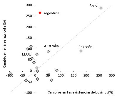 Figura 2. Cambio en el área agrícola en función del cambio de las existencias de bovinos entre el periodo BASE y ACTUAL. Cada punto representa un país.