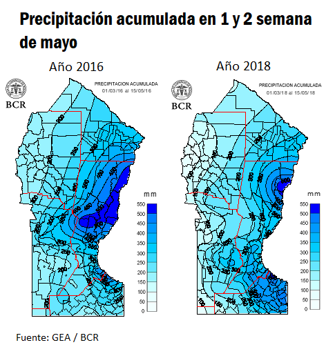 Haciendo una analogía con lo que ocurrió en el año 2016, cuando las precipitaciones desde que comenzó el otoño al 15 de mayo superaron en algunas zonas los 500 mm (mapa izq), este año el evento fue más leve en cuanto a precipitaciones acumuladas. Sin embargo, en la isohieta de los 300 mm acumulados (mapa der) son regiones donde la soja a cosechar exhibe importantes pérdidas por calidad.