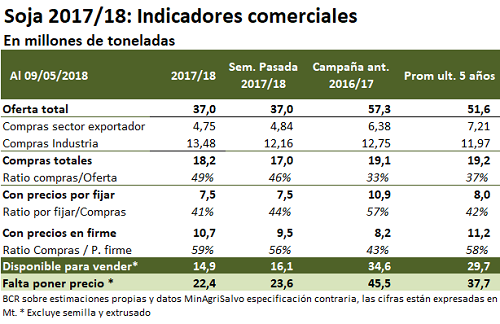 Con estos números preliminares, a dicha fecha ya se habría comercializado casi el 50 % de la producción de soja de la campaña 17/18. Este ratio se encuentra muy por encima del valor de la campaña anterior del 33 % y del promedio de los últimos 5 años del 37 %.