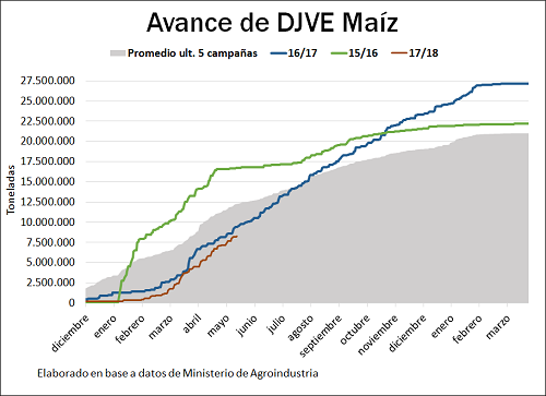 Por el lado del maíz las compras también conllevan un fuerte ritmo. Al 9 de mayo el sector exportador llevaba adquiridas 11,3 Mt, siendo un 9 % menor que lo comprado en 12,44 Mt a igual fecha del año pasado. Aun así hay que tener en cuenta que para esta campaña 17/18 la producción está estimada en 32 Mt, un 15 % menor a los producido en la campaña record anterior.