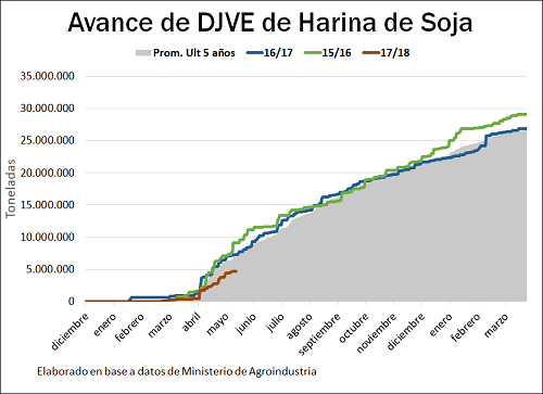 Como se nombró anteriormente, la ventas de poroto y subproductos de soja no despegan en el inicio de la nueva campaña 17/18. Las DJVE de harina de soja alcanzan al 14 de mayo 4,68 Mt mientras que en el año pasado las mismas alcanzaron 7,52 Mt. Igual retraso en el ritmo de ventas se observa en el aceite de soja con 640 mil toneladas mientras que en el año pasado las DJVE alcanzaban 1,2 Mt. Las ventas de exportación de poroto de soja llevan el peor ritmo alcanzando 859 mil toneladas, mientras que en el año pasado este valor se ubicaba en 3,6 Mt.