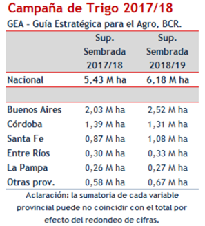 Queda poca área por sembrar de trigo a nivel nacional (10 % del total) y el ritmo de las labores fluye sin inconvenientes. Ante este panorama, GEA/BCR estima que el área sembrada alcanzará un total de 6,18 M ha, mientras que la producción tocará un record absoluto de 20 millones de toneladas.