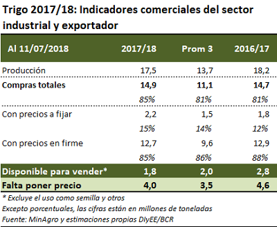 Respecto de los escuetos inventarios con que iniciaría el próximo ciclo comercial, de los indicadores comerciales 2017/18 se infiere que restan apenas 1,8 Mt de trigo libremente disponible para ser adquirido por industriales y exportadores, muy por debajo de los 2,8 M que restaban negociarse a la misma altura del año anterior y menor también a los 2 Mt que es el promedio de los últimos cinco años.