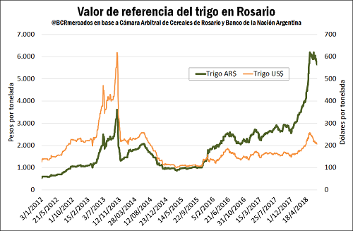 En este contexto de escasez y alentado por la suba de precios del cereal en el mercado internacional, el precio del trigo es el que mejor ha resistido la caída generalizada de los commodities agrícolas. El valor de referencia de la Cámara Arbitral de Rosario ha sido de $ 5.640/t para las operaciones del día jueves, cayendo en relación a los $ 5.720/t del jueves anterior.