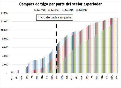 De acuerdo con las compras declaradas de trigo ante el Ministerio de Agroindustria, el sector molinero y el exportador llevaban adquirido 12,7 millones de toneladas del cereal al 2 de mayo. Este volumen representa el 73% de la cosecha de trigo 2017/18, que está estimada en 17,5 millones de toneladas. Esta relación se ubica por encima del 68% observado en la campaña pasada y el 66% del promedio de los últimos cinco años.