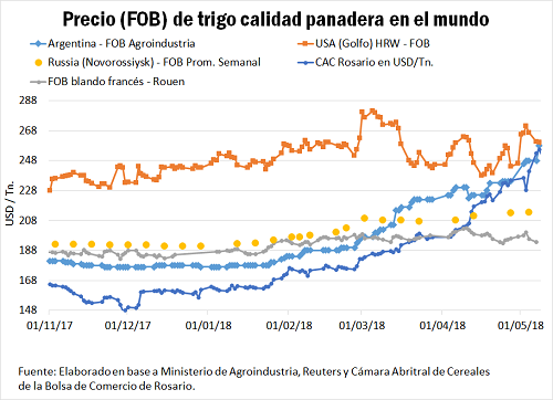 El precio del trigo por entrega inmediata marcó una suba muy importante en la semana. Según los precios pizarra publicados por la Cámara Arbitral de Cereales de la BCR, el trigo disponible Condición Cámara arrancó el lunes negociándose en $ 5.250 / t alcanzando el día jueves un máximo de $ 5.700 / t. La demanda se encuentra muy activa en este segmento registrándose un buen volumen de negocios mientras que el mercado va descontando una menor producción de trigo. Tomando la variación de los precios a una semana, comparado al día jueves 3 de mayo, el precio del trigo subió 24 USD si convertimos el precio cámara del día jueves 10 de mayo a dólares, USD 252,3 / t.