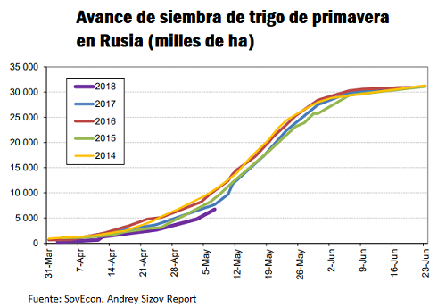 Actualmente, el mayor exportador de trigo del mundo, Rusia, está llevando a cabo la siembra de trigo de primavera, que, según las proyecciones de consultores de ese origen, arrojaría una muy buena producción, en términos históricos, aunque se ubique por debajo de lo cosechado en la campaña 2017/18. Según esas mismas fuentes privadas, la cosecha rusa de trigo podría alcanzar a 78,2 millones de toneladas, teniendo en cuenta el conjunto de las cosechas de trigo de primavera y de trigo de invierno. Ese volumen sería menor a las 85,9 Mt del año pasado debido a una disminución del área sembrada y el potencial de menores rindes debido a la menor inversión de los productores en lo que hace a insumos (semillas, fertilizantes, inoculantes, etc.). La visión del agregado del USDA en este país es otra y anticipa una producción de 72 Mt por una combinación de menor superficie y rindes ligeramente por sobre la tendencia suponiendo las condiciones climáticas resultaban normales. La misma fuente anticipaba un saldo exportable de 36,5 Mt, un poco por debajo de las 38 Mt de la 2017/18, considerando que los stocks remanentes agregarían volumen a las ventas externas compensando parcialmente la menor producción. Esta última cifra sigue siendo muy alta, por lo que el mercado de trigo está siguiendo con atención la evolución de este cultivo.