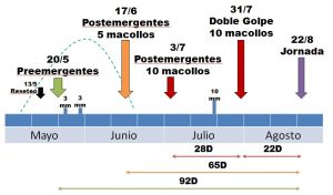 Figura 1: Fechas de las aplicaciones (flechas gruesas), precipitaciones (barras azules), curva de emergencia aproximada de Lolium (línea punteada) y días entre las aplicaciones y la jornada (flechas inferiores)
