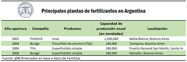 La capacidad instalada a nivel nacional de fertilizantes no alcanza para abastecer la demanda doméstica, por lo que una gran proporción de estos insumos se importa junto con materias primas como la roca fosfórica. En el 2021, Argentina consumió 5,6 Mt de fertilizantes, de los cuales 4,5 Mt fueron importados y 1,1 Mt fabricados en el país. Las importaciones en dicho año ascendieron a U$S 2.200 millones, siendo los productos más adquiridos en el exterior Urea, Fosfato Monoamómico (MAP) y Fosfato diamónico (DAP).