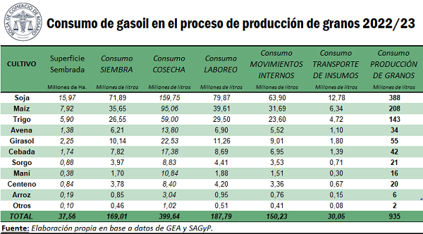 De este modo, el consumo de gasoil en el proceso productivo para la campaña 2022/23 podría ubicarse en 935 millones de litros, aproximadamente un 1% por debajo del consumo del ciclo 2021/22, resultado de una leve disminución en la superficie sembrada total.