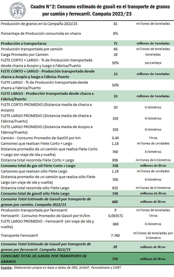 Del modelo se llega a la estimación de que el transporte de granos consumiría en la campaña 2022/2023 unos 724 millones de litros de gasoil. El 96% de dicho consumo sería realizado por camiones, mientras que el 4% restante se haría mediante el transporte ferroviario. Por la merma productiva, si se compara con el ciclo 20121/22, este tipo de consumo sería un 37% inferior.