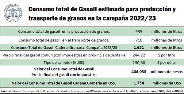 Tomando como referencia un promedio de la cotización del gasoil común en las localidades de Armstrong, Marcos Juárez, Casilda y Venado Tuerto, consultado del Ministerio de Energía, Minería y Transporte ($244,7 por litro al 15/05/2023), y la punta compradora del dólar mayorista del Banco Nación (U$S 230,3 a la misma fecha), se computa un costo de U$S 1,1 por litro de gasoil, que se supone aplicable a toda la campaña comercial.