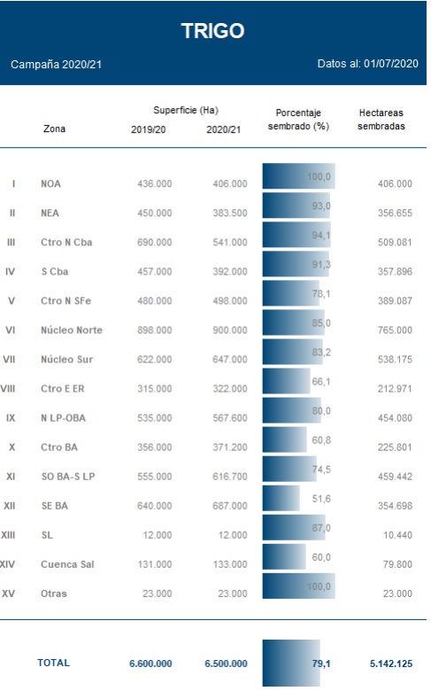 De la nueva proyección de superficie de 6,5 MHa para el ciclo en curso, se encuentran implantadas el 79,1%. En Córdoba, NOA, NEA y sectores del Núcleo Norte, la siembra y el desarrollo del cultivo están comprometidos por déficit hídrico. En paralelo, en el sudeste bonaerense y Entre Ríos las lluvias y lloviznas generan falta de piso para el avance de las maquinas. Finalmente, un 16 % del área sembrada refleja una condición de cultivo regular/mala, como consecuencia al déficit hídrico que afecta al 64 % del área. Respecto al desarrollo del cultivo, los cuadros más adelantados comienzan a encañar en el norte del país.