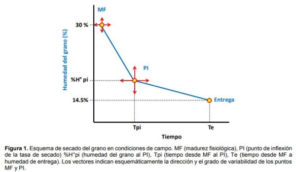 La Fig. 1 muestra las etapas del secado del grano a campo para un maíz de siembra tardía. Si bien existe variabilidad entre híbridos, la acumulación de materia seca cesa en el grano cuando la humedad es cercana a 30%. En este momento se considera que el cultivo alcanzó la madurez fisiológica (MF). El tiempo en días que tarda un híbrido en llegar a MF puede variar por la disponibilidad de asimilados, la temperatura media o la ocurrencia de eventos de temperaturas extremas como heladas. A partir de MF, la tasa de secado depende exclusivamente de la humedad del grano, la temperatura y la humedad relativa durante el otoño. Si las condiciones son favorables, se pueden registrar tasas de secado entre 0.5 – 0.7% diarias. A medida que el secado del grano progresa, las temperaturas son progresivamente más bajas y la humedad relativa aumenta, se observa una ralentización de las tasas de secado. Este cambio en la tasa de secado se da a partir de un punto de inflexión (Pi) que está determinado por una combinación de factores inherentes al híbrido (morfología de espiga, chalas y grano) y las condiciones ambientales. Aún para un mismo híbrido, el tiempo (Tpi) y la humedad del grano (H°pi) en la cual se da este Pi puede variar interanualmente o por efecto de la fecha de siembra. Desde Pi en adelante, la nueva tasa es menor a la tasa inicial, entre 0.2 y 0.06 % diaria según promedios interanuales para un set de híbridos representativos del área de la EEA INTA Oliveros.