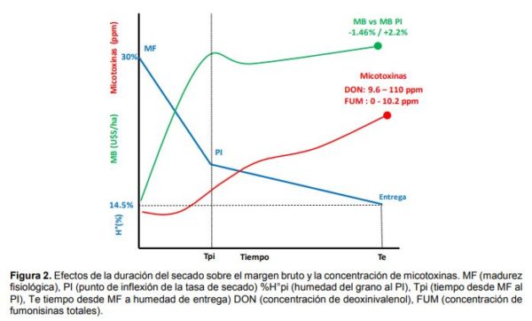 Un aspecto que frecuentemente se señala como desventaja de las siembras tardías es el excesivo tiempo que el cultivo permanece en el campo hasta que la humedad del grano se considera propicia para cosecha. El objetivo principal de esta práctica es minimizar la pérdida económica que representa recurrir al acondicionamiento de la mercadería y el impacto sobre el flete. Sin embargo, en estudios recientes (Ferraguti et al., 2016), se pudo comprobar que esta interpretación no siempre es correcta, sobre todo si se tiene en cuenta el aumento de descuentos por el rubro granos dañados (Norma XII, ex SAGYP) y los costos de aplicación a la población de malezas que crece y se desarrolla durante el secado del grano. Si bien existe margen para la discusión e interpretación de resultados, lo más alarmante de este trabajo fue la evidencia de que esta estrategia de secado implicó un alto grado de contaminación con micotoxinas.