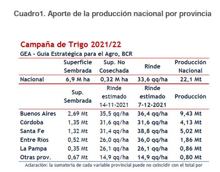 La súper cosecha de trigo fue sin duda el aspecto destacado de la campaña marcando un nuevo récord y sobrepasando considerablemente las expectativas iniciales. El área destinada al cultivo de trigo en Argentina durante la campaña 2021/22 fue de 6,7 millones de hectáreas, mostrando un incremento respecto de la campaña anterior. La producción nacional estimada a la fecha es de 22,6 millones de toneladas (Mt) según el Ministerio de Agricultura, Ganadería y Pesca (23/12/21) con un aumento del 25,6 % respecto de la campaña precedente. Entidades privadas como la Bolsa de Comercio de Rosario (BCR) estiman una producción de 22,1 Mt, con un rinde nacional de 33,6 qq/ha, 600.000 toneladas superior a lo previsto por la Bolsa de Cereales de Buenos Aires (BCBA) que calcula la cosecha en 21,8 Mt.