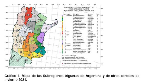 Según comunicación del Ing. Enrique Alberione, fitopatólogo del INTA Marcos Juárez, en la región productiva amplia se observó presencia de roya amarilla o estriada (Puccinia striiformis) y roya anaranjada o de la hoja (Puccinia triticina) aunque con retrasos en sus apariciones. Puntualmente algunas variedades se vieron más afectadas debido a su nivel de susceptibilidad. A pesar de que las condiciones ambientales resultaron favorables (lluvias y temperaturas) a partir de comienzos del mes de septiembre, ambas enfermedades no tuvieron fuerte impacto sobre el rendimiento de granos y el control de las mismas se hizo con una sola aplicación de fungicidas. Otro aspecto a destacar fue la presencia de virus del mosaico estriado de trigo (WSMV) – agente vector Aceria Tosichella Keifer, en campos experimentales y en algunos lotes de productores cercanos a las localidades de Marcos Juárez y Pergamino. Se observó diferencia varietal frente a esta enfermedad. Desde hace 35 años el personal del Laboratorio de Calidad Industrial y Valor Agregado de Cereales y Oleaginosas del INTA Marcos Juárez realiza un relevamiento en acopios y cooperativas de la región central del país para conocer la calidad de cosecha de cada año. Con centro en la ciudad de Marcos Juárez se tomaron muestras representativas del calado de camiones de localidades de las subregiones 2 (Pampeana ondulada norte), 3 (Pampeana ondulada sur), 7 (Pampeana subhúmeda norte) y 8 (Pampeana semiárida norte), según mapa de las Subregiones trigueras de Argentina y otros cereales de invierno (Gráfico 1). En el presente relevamiento se muestrearon 815.000 toneladas correspondiente a 94 acopios y cooperativas.