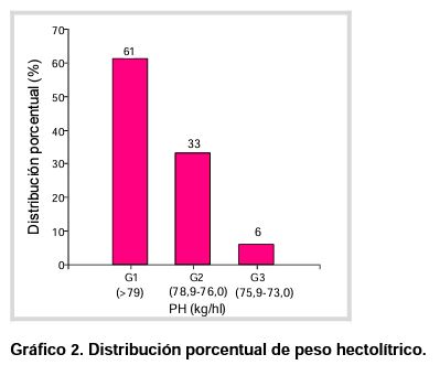En la presente campaña el PH promedio del muestreo fue de 79,26 kg/hl, con un mínimo de 74,80 y máximo de 82,90 kg/hl, superior a la cosecha anterior que fue de 78,20 kg/hl. Ninguna de las muestras analizadas de los distintos conjuntos presentó valor inferior a 73,00 kg/hl (fuera de estándar). De acuerdo a los resultados obtenidos el 61 % corresponde al Grado 1 (G1) de comercialización, 33 % al Grado 2 (G2) y el 6 % como Grado 3 (G3), según el estándar de comercialización de trigo pan, Resolución 1262/2004 – Norma XX. El PH promedio en la Subreg 2 fue de 80,00, Subreg 3 (77,70), Subreg 7 (79,50) y Subreg 8 79,20 kg/hl (Gráfico 2). El P1000 promedio fue 35,52 g, superior a la cosecha anterior que fue de 31,94 g. El rango observado fue de 30,42 a 44,88 g.