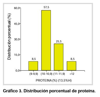 La proteína promedio del relevamiento fue de 10,8 %, muy próxima a la base de comercialización del 11,0 %, con un 34 % de las mismas superando este valor. El mínimo fue de 9,1 % y máximo fue de 13,0 % (Gráfico 3). Las Subreg 3, 7 y 8 tuvieron valores de 10,9, 10,9 y 11,0 % respectivamente, presentando la Región 2 el menor valor de 10,3 %. Se debe tener en cuenta que para recibir bonificaciones por contenido de proteína ésta debe ser superior al 11,0 % y el PH ser igual o superior a 75 kg/hl.