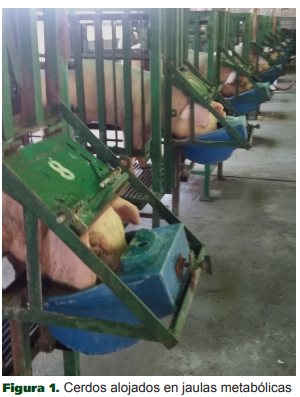 Se realizó un ensayo tendiente a determinar la digestibilidad de energía en el DDGS, MZ y harina de soja (HS) en un galpón de ambiente semicontrolado en la Sección Porcinos de la EEA Pergamino. El protocolo experimental fue aprobado por el Comité Institucional de Cuidado y Uso de Animales de Laboratorio (CICUAL) de la Facultad de Ciencias Veterinarias de la Universidad de Buenos Aires (2017/03). La concentración de energía digestible (ED) fue determinada a través del método de recolección total descripto por Adeola (2001). A tal fin, 8 cerdos castrados de una línea comercial con un peso inicial promedio 50 kg, fueron asignados al azar a 2 cuadrados latinos (4 x 4) y alojados individualmente en jaulas metabólicas (1,00 x 1,15 x 0,80 m), con piso de barrotes de hierro, un comedero, un bebedero tipo nipple y bandejas recolectoras para la recolección total de heces (Figura 1)
