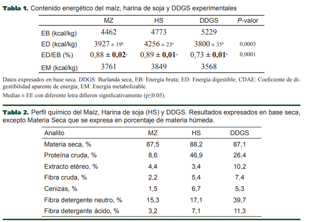 Contenido y digestibilidad de Energía Se detectaron diferencias estadísticamente significativas en el contenido de ED entre los ingredientes (p=0,0005; Tabla 1). La HS fue el ingrediente que presentó mayor contenido de ED y, si bien resulta superior a los valores citados por NRC (2012) y Rostagno et al. (2017), concuerda con lo informado por otros autores. Esta elevada ED podría explicarse por el mayor contenido de EE en la HS utilizada, en comparación a valores normalmente listados para el mismo ingrediente. Si bien la EB de los DDGS resultó 767 kcal/kg mayor a la del MZ, la ED de los dos ingredientes no se diferenció a causa del menor coeficiente ED/EB del coproducto (Tabla1). Este dato coincide con lo revisado por Stein y Shurson (2009) quienes remarcan que, a pesar del alto contenido en EB, los DDGS presentan una ED y EM similar al MZ. Esto podría explicarse por el elevado contenido de fibra, en su mayor proporción insoluble, presente en los DDGS, que actúa diluyendo la energía contenida en las dietas. Esto último se refleja en los coeficientes ED/EB de la HS y del MZ, que resultaron estadísticamente mayores que el DDGS. En cuanto a la EM calculada para el DDGS (3568 kcal/kg MS) concuerda con valores ya reportados por otros autores estadounidenses.