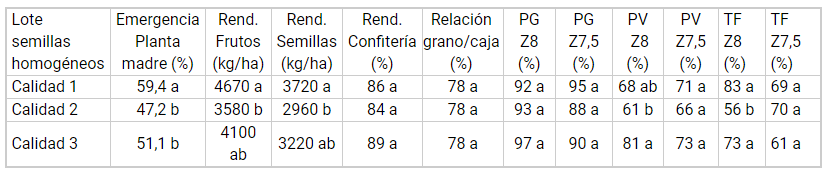 Tabla 2. Emergencia, rendimiento (frutos, semillas y confitería) relación grano/caja, germinación y vigor, según calidad de semillas del lote.
