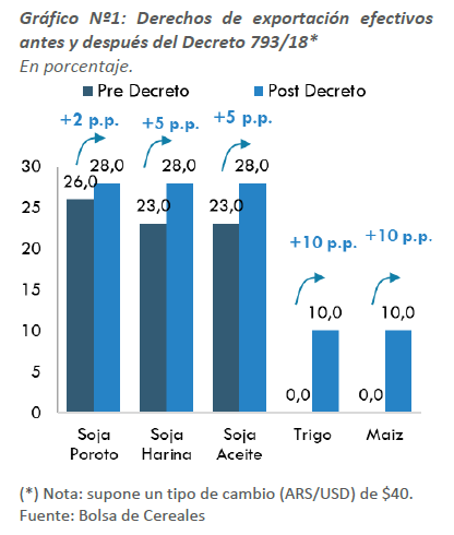Desde finales del mes de abril, la economía argentina ha registrado una serie de shocks externos e internos que desembocaron en una fuerte depreciación del Peso, aceleración de la inflación y contracción del nivel de actividad. En ese contexto, y con el objetivo de adelantar la consolidación de los desequilibrios de las cuentas públicas, el gobierno nacional modificó el esquema de alícuotas a las exportaciones a través del decreto 793/18 del 3 de septiembre de 2018.
